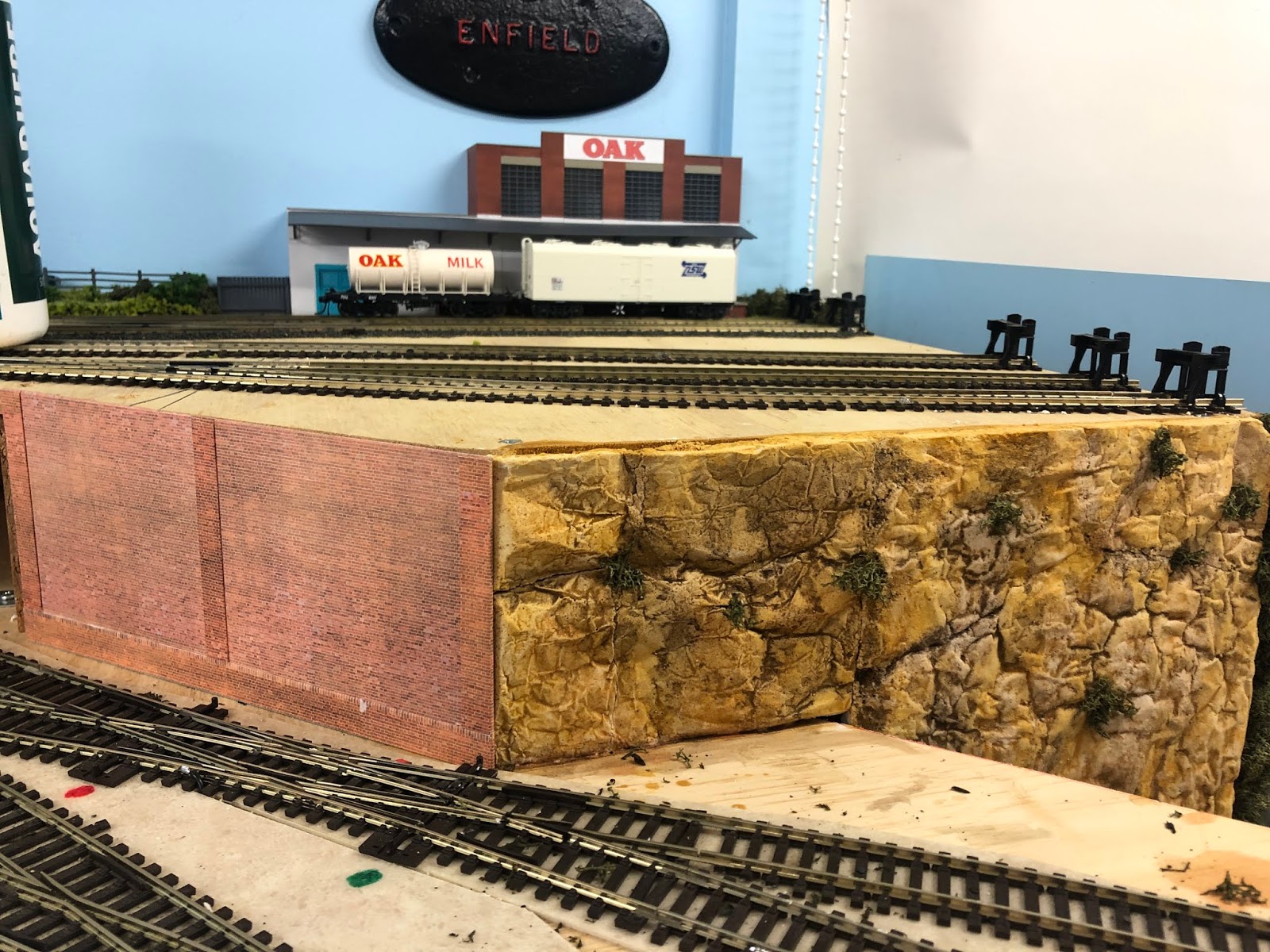 The section to the left of the rock wall will be a brick retaining wall leading up a bridge or a tunnel portal.